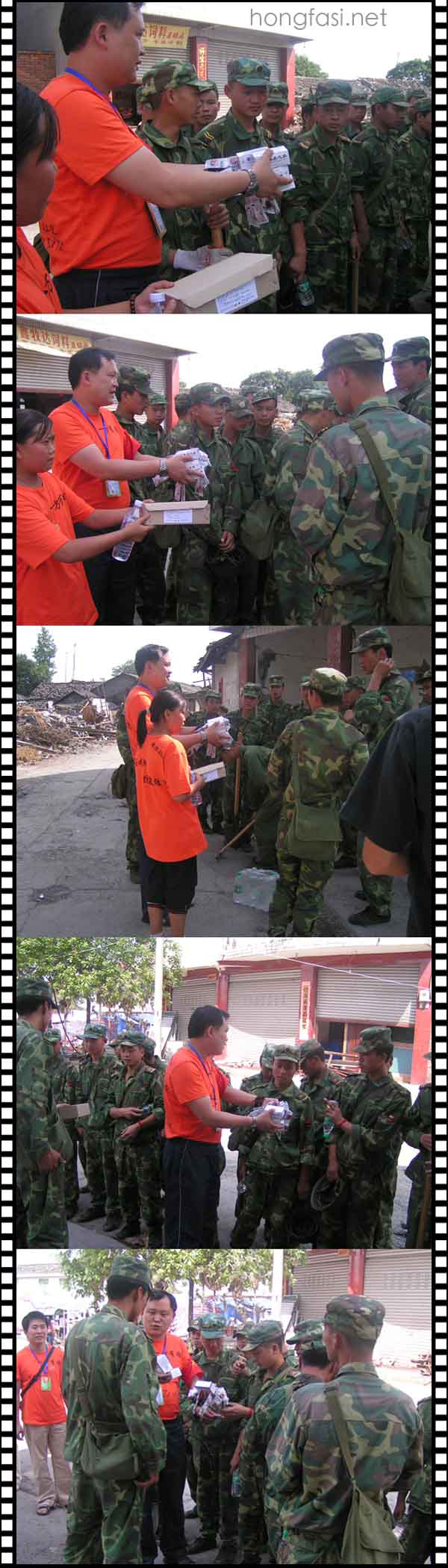 这可是我们在多次赠物尝试中,好不容易成功的一次。这些子弟兵纪律严明,从不拿灾区的物资!自己再累再饿再病再痛再需要也不去取物!即使我们千方百计送过去也不接收!然而,我们深知他们的身体也达到了负荷的极限,我们熬煮的汤药和施放的成药正是他们所需!我们在征得领导同意之后,最终成功的送到了他们手中!只为你,可亲可敬的子弟兵们!