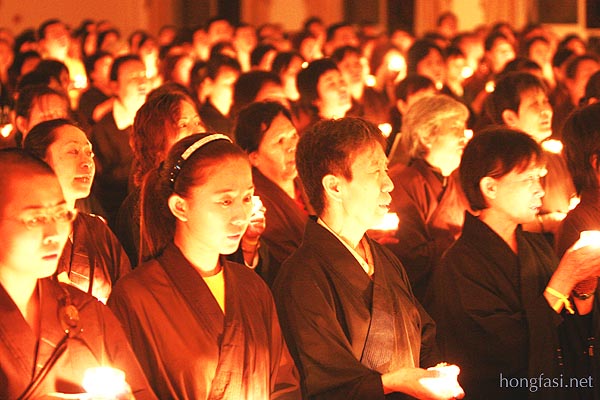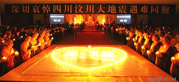 弘法寺四众弟子手捧蜡烛默哀三分钟,在经堂深切哀悼汶川大地震遇难同胞。