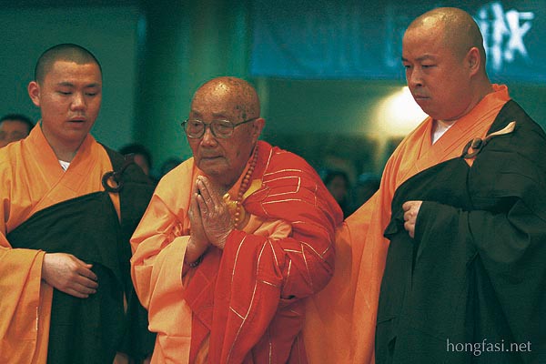 在汶川大地震遇难者祈悼法会上,弘法寺方丈本焕长老主法,为遇难众生超度