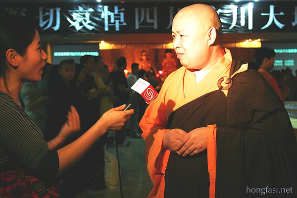 为四川汶川大地震遇难者祈悼法会上,在弘法寺经堂,省政协委员、深圳市佛协副会长兼秘书长深圳市弘法寺监院印顺法师接受深圳卫视采访。
