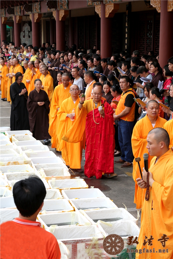 心静长老手持甘露水,领众唱念放生仪文,以杨枝遍洒待放生的物命,大众唱诵观世音菩萨圣号绕场三匝