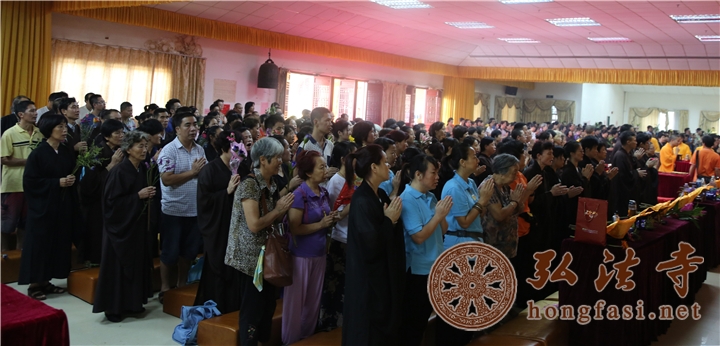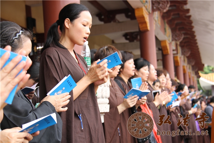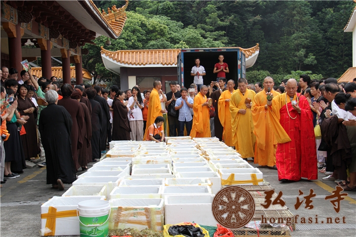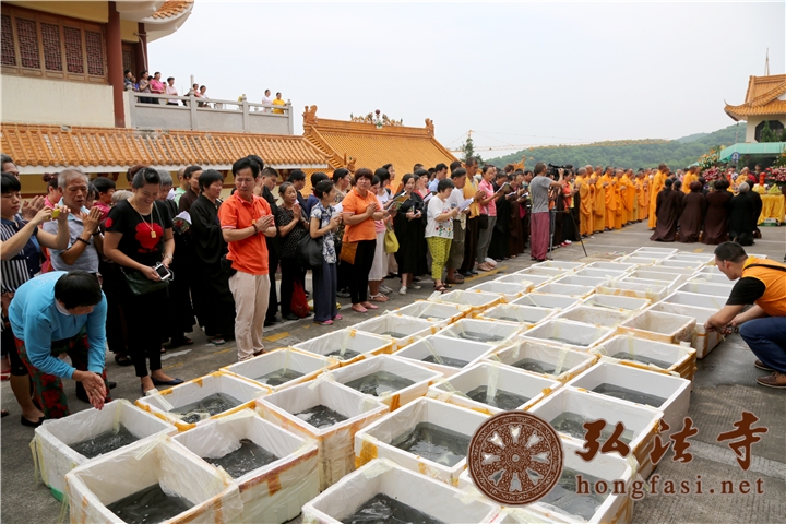 上午11点30分,水陆大法会放生活动在弘法寺斋堂前隆重举行。在庄严的佛陀圣像前,上万生灵受佛法加持皈依后回归大自然,众善信在常住法师的带领下,为物命作三皈依