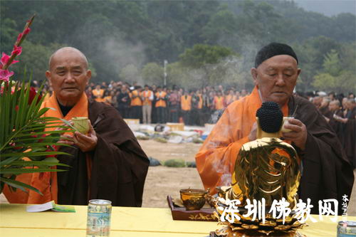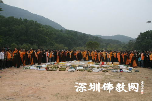两位主法和尚首先在香案前念诵放生仪规,接着引领众僧梵唱,列席两边的居士们也是异口同声地梵唱。一段梵唱之后,主礼法师开始对放生物洒净,祈福加持。