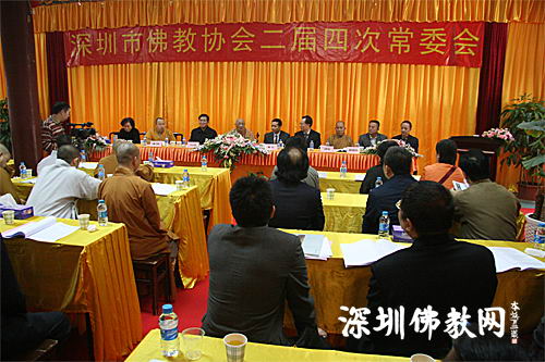 深圳佛教网讯: 12月29日上午,市佛协在弘法寺讲经堂隆重召开二届四次常委会,会长本焕长老、常务副会长赵利生居士,副会长兼秘书长印顺大和尚,副会长心静法师等25位常务委员出席了会议(全部共28位),非市佛协常委的寺院负责人列席了会议。市委统战部常务副部长、市民宗局局长冯安群,市委统战部副部长、市民宗局副局长姚任也于会议第二阶段莅临指导。