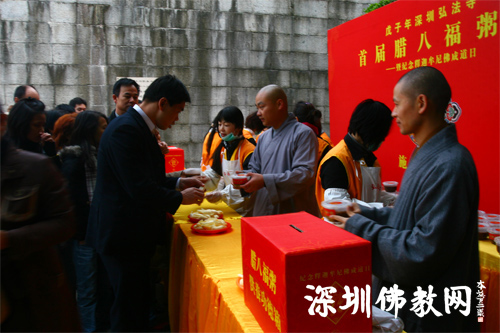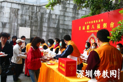 2008年元月3日是农历十二月初八,中国传统的腊八节,这一天老百姓有吃腊八粥的习俗。今年的腊八节,是当代佛门泰斗本焕长老的衣钵弟子印顺大和尚荣膺弘法寺第二代方丈的第一个腊八节,为隆重纪念佛教创始人释迦牟尼的成道之日,同时与民俗文化结合起来,让民众在吃“腊八粥”中生起感恩之心,共同祈福国泰民安,社会和谐,深圳弘法寺在仙湖弘法寺斋堂、斋菜馆门前停车广场、东湖公园万佛禅寺门前广场等地施送腊八粥,与前来参加的广大市民共同过一个祥和、平安、顺畅、健康的腊八节日。