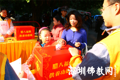 已经过去的2008年,悲伤和惊喜洗礼了国人的心理,自然的灾害令国人更坚强更智慧,世界“金融海啸”让国人更冷静更理智,奥运会的成功举办圆满了国人的百年梦想,载人飞船的发射成功让世人看到中华民族的伟大复兴。在新的一年开始的时候,国人用各自的方式福佑中华。深圳弘法寺在鸣钟祈福后的第三天又用施“腊八粥”的方式参与祈福活动。该寺院僧人和居士早在前几天就开始做准备工作,买来几千斤糯米以及红枣、莲子、核桃、栗子、杏仁、松仁、桂圆、葡萄、菱角、青丝、玫瑰、红豆等30多种原料,元月2日他们就把这些原料洗净,元月3日也就是农历腊月初八凌晨就在深圳弘法寺斋堂、弘法寺斋菜馆烧起大灶大锅,按照一定顺序加入各种原料,熬制腊八粥。清早6点就在仙湖弘法寺斋堂、斋菜馆门前停车广场、东湖公园万佛禅寺门前广场等地向先赶来的市民派发腊八粥,将一直持续到中午。