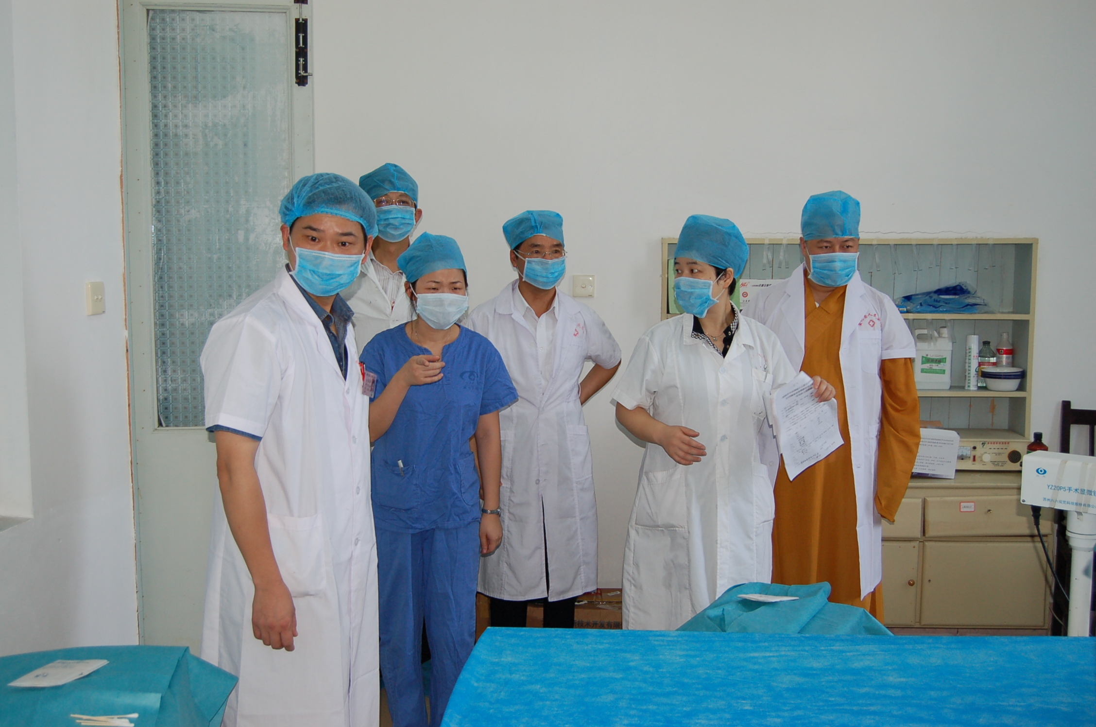 印顺大和尚(右1)在安化县杨光鑫县长(左2)的陪同下到手术室看望患者和医护人员
