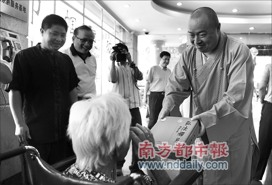 深城记者王成波 报道 “感谢你们给我们送月饼,谢谢……”前日上午,深圳弘法寺方丈印顺大师来到罗湖区社会福利中心和深圳市社会福利中心等,为老人以及孩子们送去1000余盒“弘法禅月”月饼。福利中心的相关负责人表示,感谢弘法寺的慈心善举。
