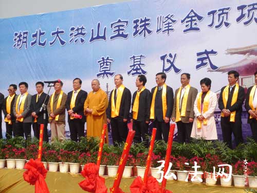 湖北省副省长张通先生一行及省直相关部门负责人前来出席观礼,随州市委副书记、市长刘小鸣主持奠基仪式,市委书记马清明讲话;中国佛教协会副会长、海南省佛教协会会长、深圳市佛教协会会长、弘法寺方丈印顺大和尚一席奠基说偈,对众人启发良深。最后,由湖北省副省长张通先生宣布:湖北省随州大洪山宝珠峰金顶奠基仪式开始!一时间,锣鼓齐鸣,鞭炮声声,祥云朵朵,人群欢腾,奠基仪式圆满成功,预示着工程建设顺利展开。