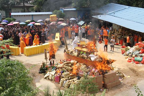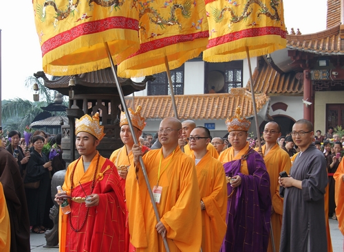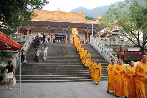 下午2点,弘法寺内钟鼓齐鸣,梵音清扬,二序仪仗,庄严肃穆。在虔诚的念佛引导声中,本次法会总主法中国佛教协会副会长、弘法寺方丈印顺大和尚与内坛主法法师、正副表各法师,率全体法师及斋主善信等奉请圣驾,举行了隆重的送圣仪式。庄严仪式中,众人齐心恭送十方法界诸佛菩萨圣众请登云路,六道之凡众并诸眷属往生净土。所谓:“圣众请归云路,六道众生往生净土”。旌旗飘扬,大雄宝殿内外人人手持鲜花与香烛,个个虔诚而肃穆,送圣仪式历时近一小时,庄严神圣,传统隆重。至此,弘法寺2013年法界圣凡水陆大法会圆满结束,皆大欢喜。