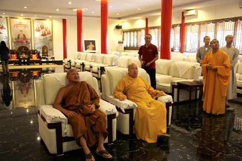 据悉,2011年12月,印顺大和尚曾受邀出访泰国,出席泰国国王84岁生日庆典,并获泰国国王御赐“华僧大尊长”荣誉称号,期间,对泰国受洪涝灾害4个多月的地区进行慰问和赈灾。其时,他曾经听闻老虎寺的由来和僧人慈悲豢养受伤老虎的义举。今日老虎寺住持Chan一行到访,印顺大和尚通过Chan住持的介绍,详细了解了老虎寺保护百余只“印支虎”最新进展情况,一起观看了老虎寺“人虎和谐”奇异场景的幻灯片,并探讨未来在中国大陆共同携手开展慈善护生、环保公益等事业,以弘扬佛教的慈悲精神,利益有情。印顺大和尚还陪同Chan一行参观了弘法寺开山祖师本焕长老的舍利展览室。