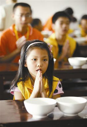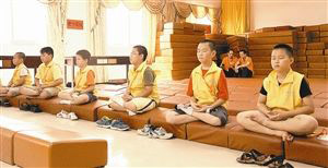 其实,这样的少儿国学夏令营并非新鲜事,弘法寺已成功举办四届,今年将共举办四期,每期五天,孩子们大都为9至13岁的儿童。在这个班里,共有72个孩子,被分为12组。生活老师主要由弘法寺的义工担当,授课老师包括法师及从外面请来的各领域专家。
