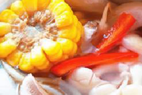 锅底材料:300㏄,玉米1支,黄豆芽1把,火锅料:3片,杏鲍菇6朵,白菇100公克,鲜香菇2朵,红椒1/2个,冬粉1把