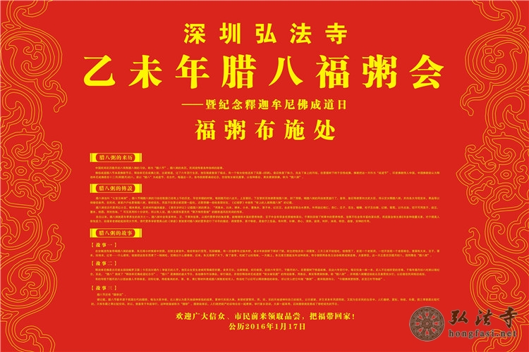 为感念佛陀的慈悲和伟大,弘法寺谨定于2016年1月17日举办腊八福粥会。欢迎广大善信、市民前来弘法寺山门口广场领取品尝,广结善缘,带福回家!