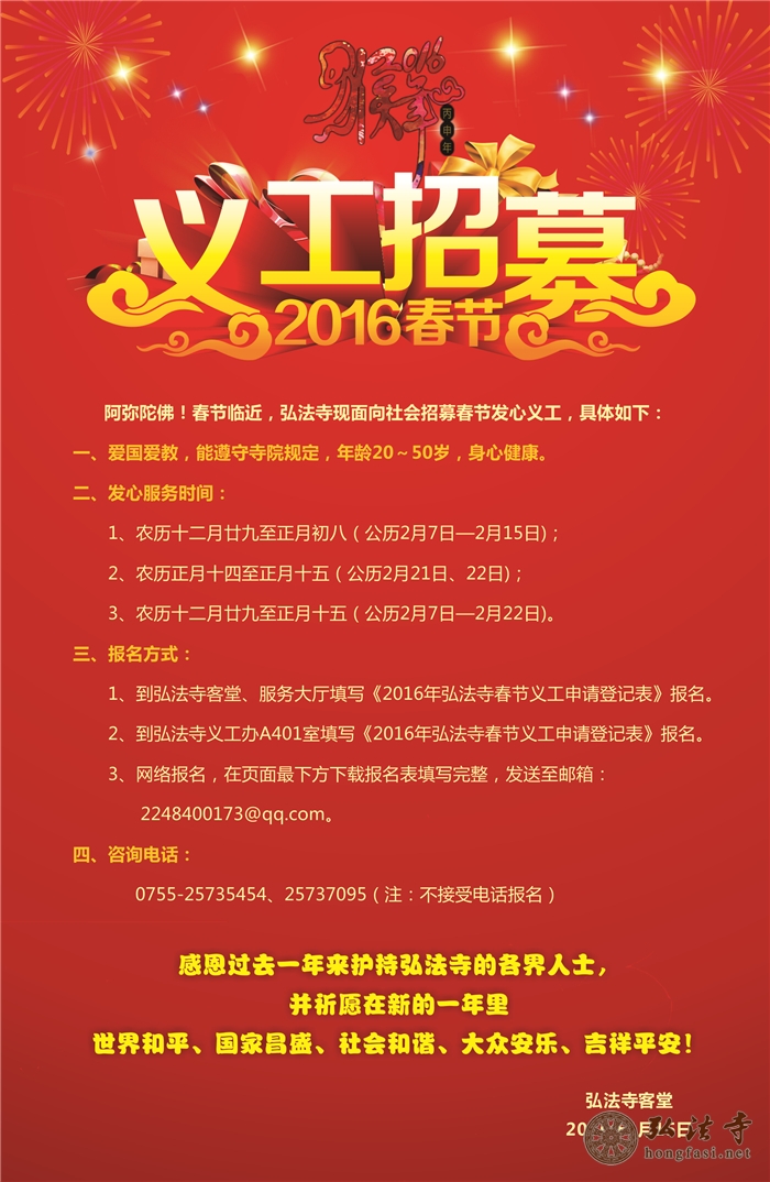 阿弥陀佛!春节临近,弘法寺现面向社会招募春节发心义工,具体如下: