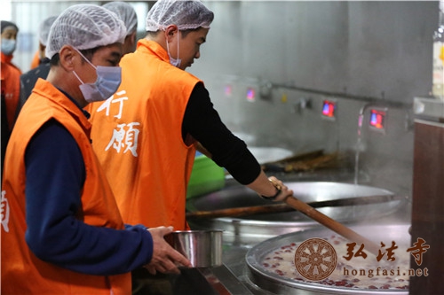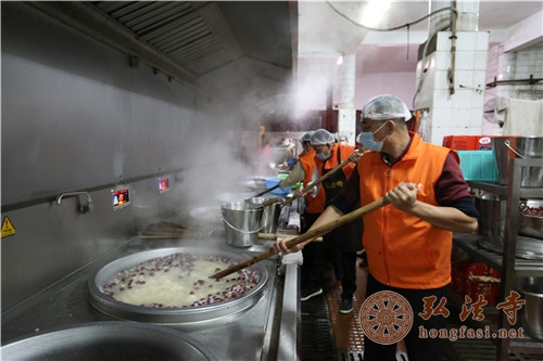 腊八福粥食材于23日已经准备好,24日凌晨,弘法寺斋堂早早就开始忙碌起来,义工菩萨们按照制作腊八福粥的流程在厨房里耐心细致地熬制腊八福粥。至清晨,已经熬出了近百桶,送至弘法寺山门广场,与大众结缘。