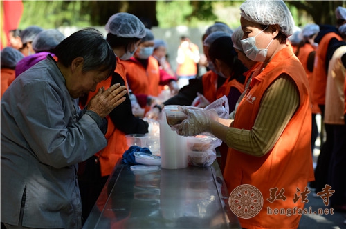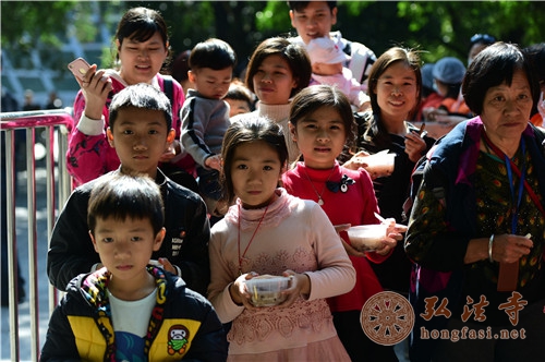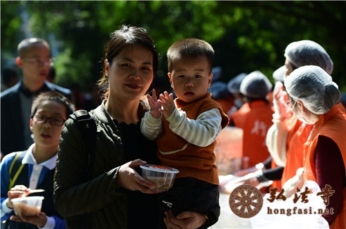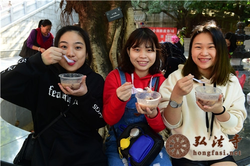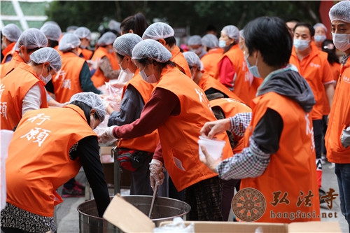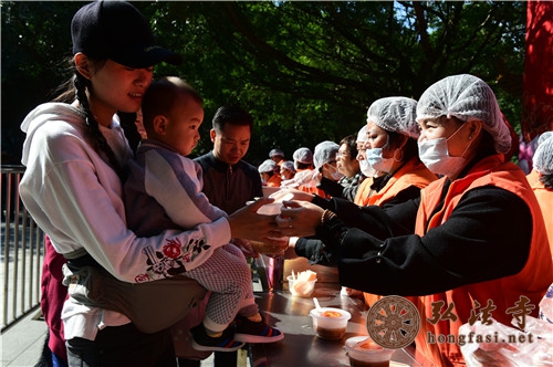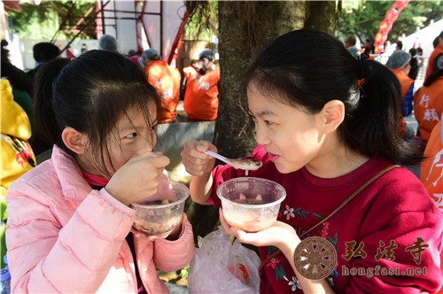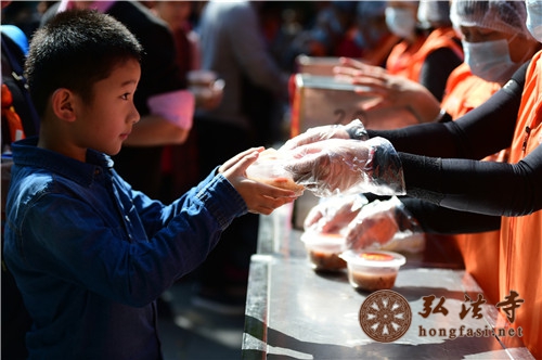 是日上午7时许,天朗气清,现场开始派发腊八福粥。通往弘法寺的路上,善男信女络绎不绝,前往腊八福粥会现场,结缘到了弘法寺为大家精心准备的腊八福粥,满心如愿,笑逐颜开。由于群众过于热情,中午时分,腊八福粥一度供不应求,为保证每一个人都能吃到这一年一度的腊八福粥,弘法寺斋堂继续加班加点熬粥,普施数万份腊八福粥,以满足信众的需求。