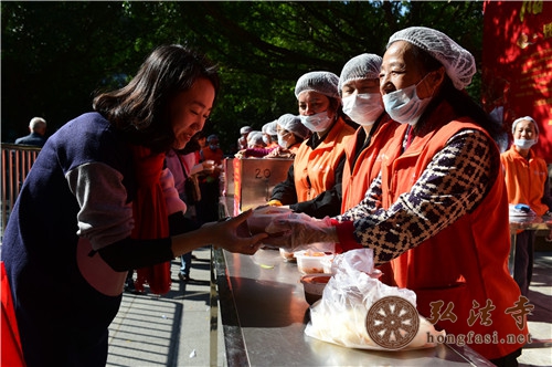 据智法法师介绍,腊八节也是中国佛教徒的重要节日,《敕修百丈清规》记载,腊月八日,恭遇本师释迦牟尼佛成道日,率比丘众,严备香、花、灯、烛、茶、果、珍馐,以伸供养。弘法寺继承传统,定期举办腊八福粥会,自2009年至今,弘法寺的腊八福粥会已经举办了十届,与大众广结善缘,为继承发扬佛陀的精神发挥了重要的作用。